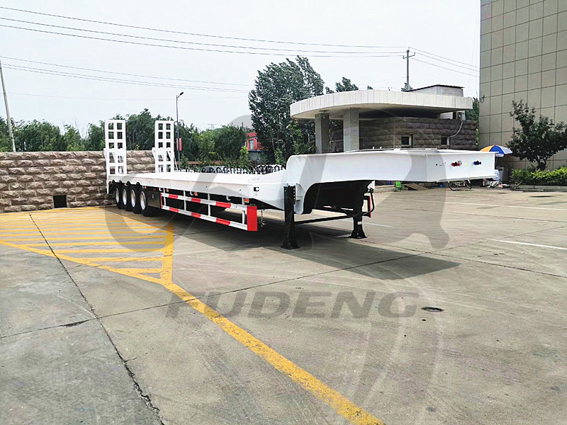 We design 16.3m length and 3m width because our customer want to transport 40ft container, also make 8pcs container locks on lowboy deck. 5mm thickness of loading deck can transport excavator and bulldozer, long lowboy trailer can put two machines together at one time.