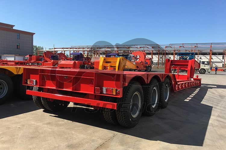 FUDENG 3 axles 100 tons max payload front loader low bed semi trailer with wood floor. Customer need the front loading lowboy trailer to carry his extra heavy crane and bulldozers etc construction machinery and equipment, requested to install the wood floor on the both side wheel loader part. The customer already prepare the wood floor by his side, need our factory to remain the place to install his wood floor during production. FUDENG can provide custom-made service to customers so this is no a difficult task for us. After several times communicate about the drawing confirmed we start the detachable gooseneck low bed trailer production. After finish the production we sent the pictures and video for customer confirm he very like our work.