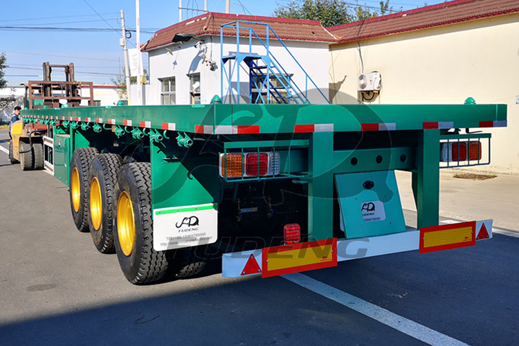 Fudeng Factory can product 3 axles 40ft flatbed semi trailer, it will transport 1*40ft container or 2*20ft container, we install 12 units container locks for our customer. Welcome your inquiry, any question can ask me.