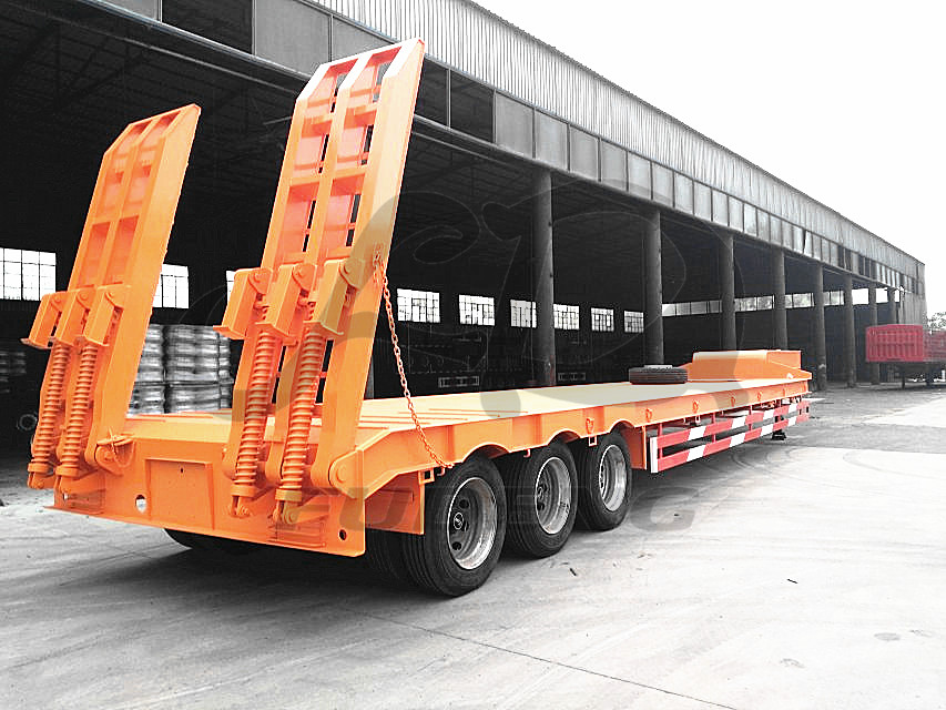 3 axles lowbed semi trailer can load 30-80tons heavy duty, customized loading deck dimension depend on your transport demand, heavy axles, thicken suspension and durable tires suit for bad road condition in Africa, welcome your inquiry, our engineer can provide best solution for your reference.