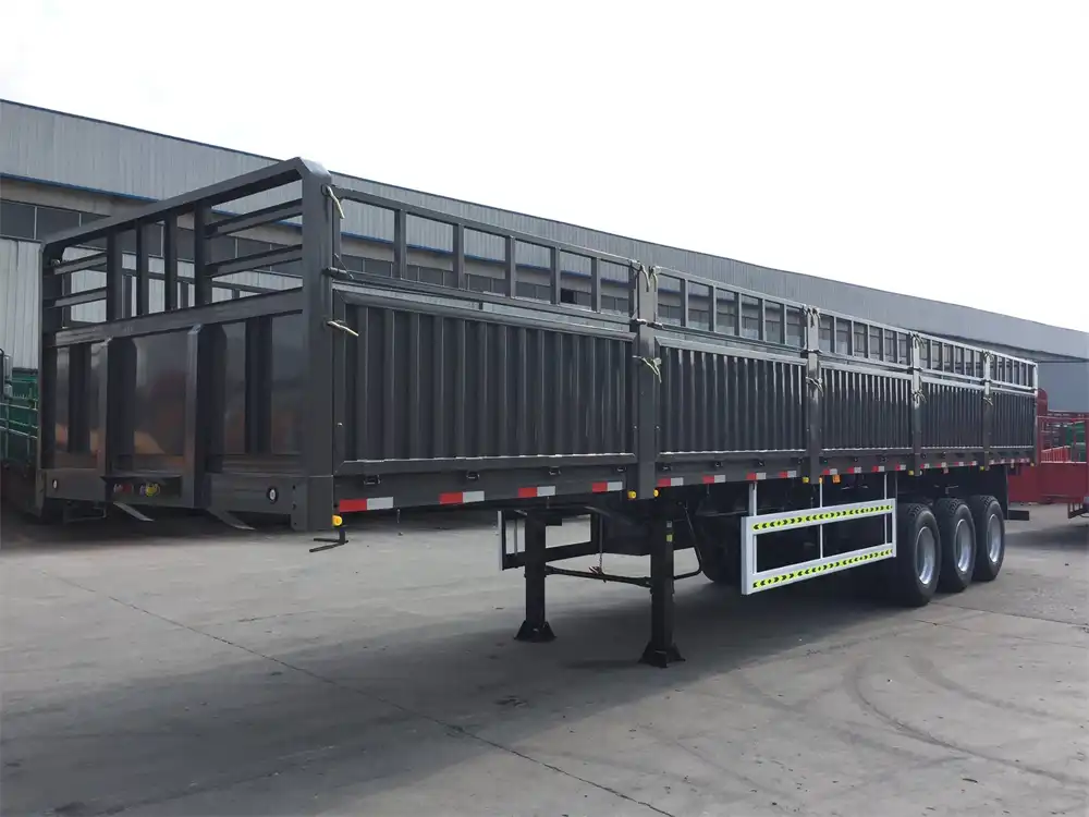 The dropside fence cargo semi trailer are designed for Nigeria customer who need to transport bagged cement. The customer don’t like the double fence type, and it be lower than the blue one, we advise the customer use one sidewall and one fence to satisfy his demand. The customer also need our fence cargo semi trailers to carry floor tile, the customer don’t need to load containers, so we didn’t install twist locks on his trailers but also design the extra space in the width because we think about the materials true usage condition for the floor tile. By this way the customer can fit into 3 lines floor tiles one time. The customer likes our design very much because we think about his really demands.