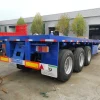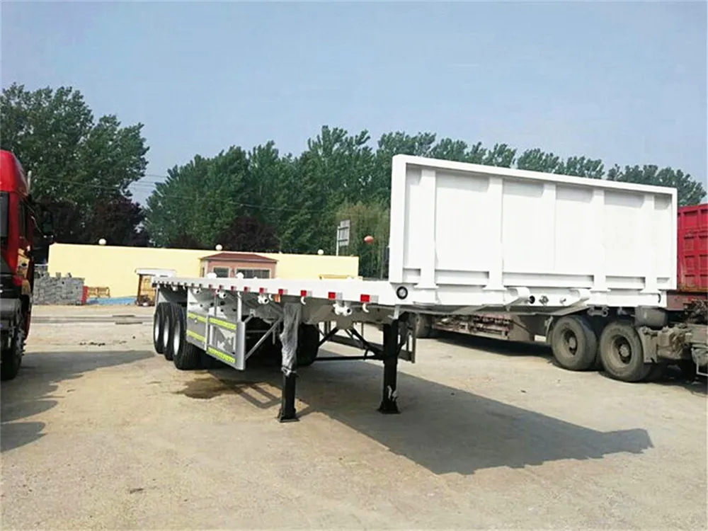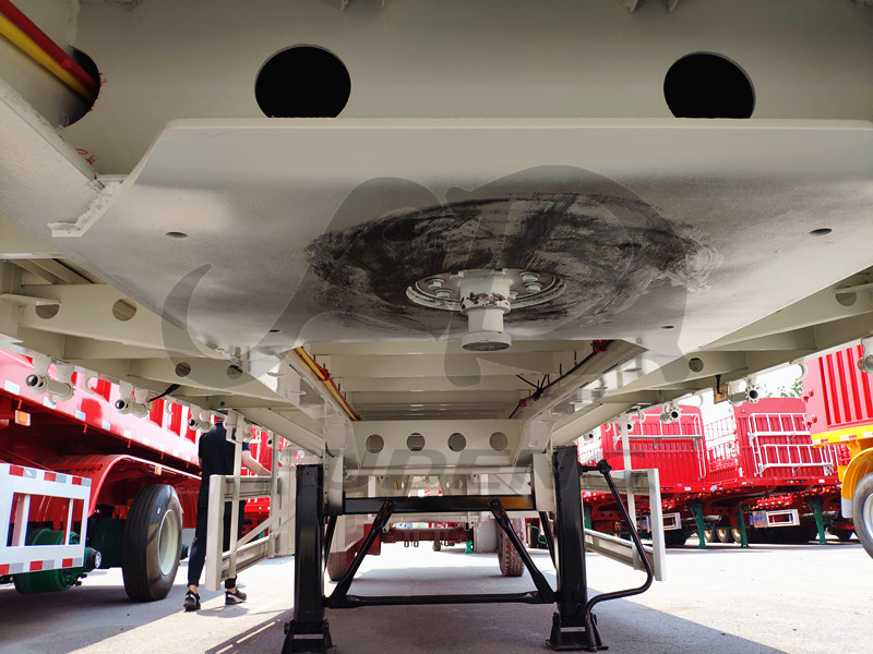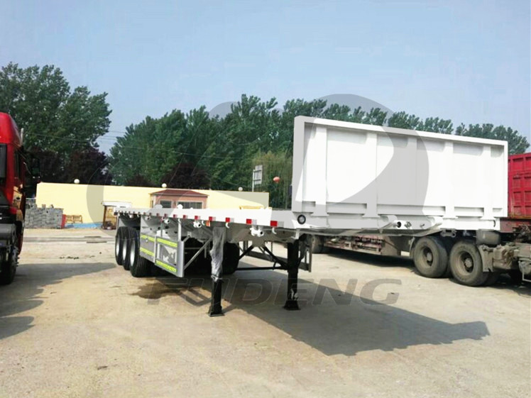 This is triaxle flatbed semi trailer, it can transport 2*20ft container and 1*40ft container. We design 1.2m front board for our flatbed semi trailer, it will be good solution when you transport bulk cargo, such as bagged cement, grain and food.